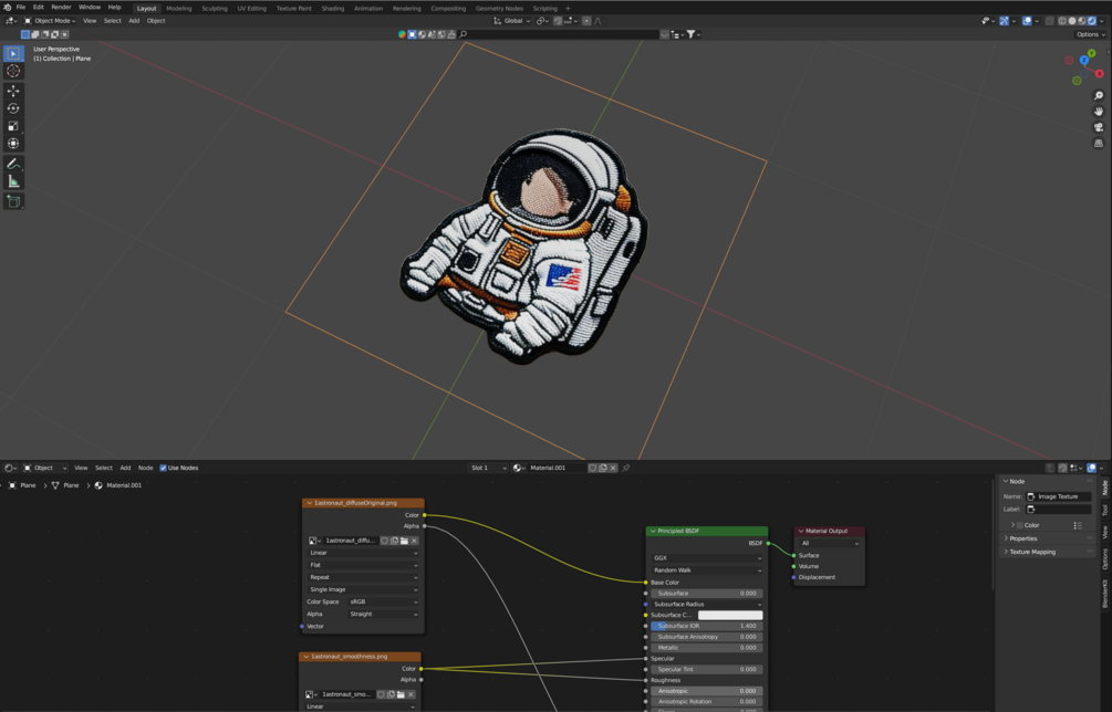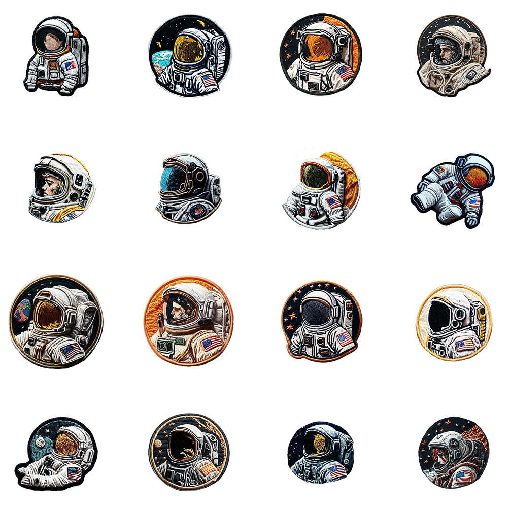 Astronaut embroidered patch. 550x550 pixels png transparent decal. pbr material: diffuse, height, normal, smoothness. Blender file with material ready to use is included. Royalty free license.